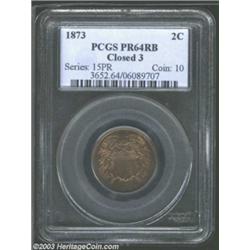 1873 2C Closed 3 PR64 Red and Brown PCGS. Final year of issue and one of the so-called "originals" from a mintage of just 600 pieces. This is a modestly reflective specimen with even mellowing on each side. Important notice: We expect to be auctioning lots at the rate of 200-250 per hour. On occasion eBay live bid software cannot keep up with the pace of the auctions where 4-5 lots per minute can hammer down, so we recommend that you place a realistic absentee bid now as insurance to avoid disappointment. Also please note that all Heritage/CAA lots purchased through eBay Live carry a 20% Buyer's Premium. Please make sure you read the Terms and Conditions.
