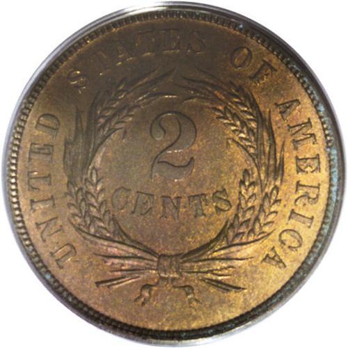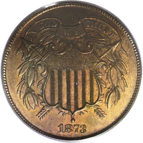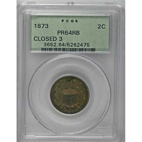 <B>1873<2C> Closed 3 PR64 Red and Brown PCGS.</B></I> This is a proof-only date with varieties known from both Closed 3 and Open 3 logotypes. In most series, 1873 proof coins are only known with a Closed 3 date style. Minor verdigris is noted. Both sides have pleasing mellow orange color with light brown toning.
