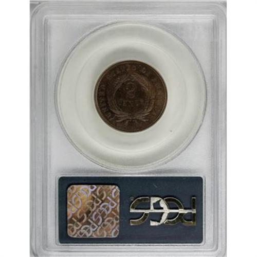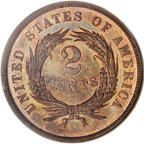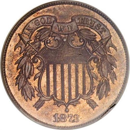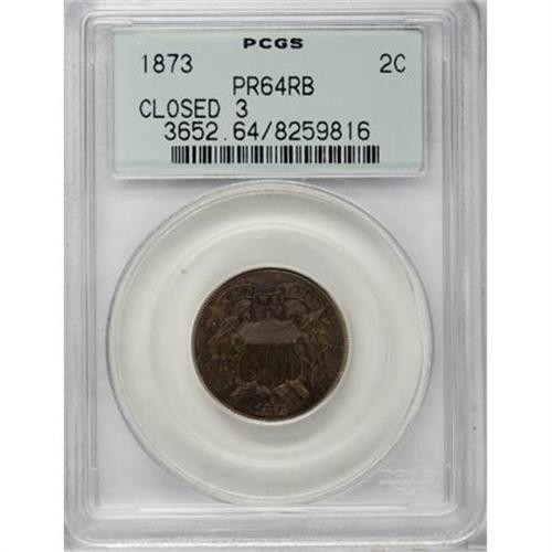 <B>1873 2C Closed 3 PR64 Red and Brown PCGS.</B></I> An early 1873 proof from the Closed 3 logotype. Harry X Boosel made the date famous with his lifetime of research. We know that proofs of most denominations are all Closed 3 pieces. This is because most proofs were struck at the beginning of the year, and the modified Open 3 logotype was not introduced until after the proofs were struck. A few exceptions, such as the two-cent piece, exist. In this denomination, all coins were proofs, including examples of both date styles. This moderately reflective proof is mostly brown, but exhibits portions of mint red on both sides.<BR><BR><B>Coin Engraver:</B> James B. Longacre<BR><BR><b>Shipping:</b> Coins & Currency (<a target="_blank" href="http://www.heritageauctions.com/common/shipping.php">view shipping information</a>)