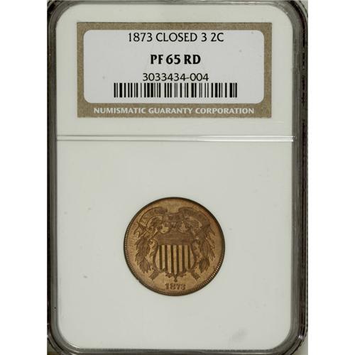 <B>1873 2C Closed 3 PR65 Red NGC.</B></I> All 1873 two cent pieces were struck in proof, and two varieties are known with differing date logotypes. An amazing Gem, this piece retains all of its original deep orange color, and it is essentially free of marks, other than a few slight carbon flecks that are only visible with magnification.<BR><BR><b>Shipping:</b> Coins & Currency (<a target="_blank" href="http://www.heritageauctions.com/common/shipping.php">view shipping information</a>)
