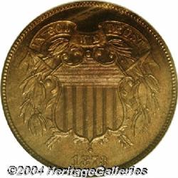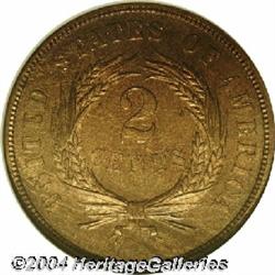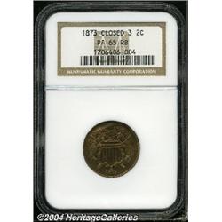 <B>1873<2C> Closed 3 PR65 Red and Brown NGC.</B></I> A scarce proof-only date, of which only 600 pieces were produced. This is an original striking, as characterized by the Closed 3 in the date. The surfaces show medium variegated patina and highly reflective fields, with no apparent handling marks. Population: 42 in 65, 34 finer (9/04). <BR><BR><B>Important notice:</B> Heritage usually auctions material at the rate of 200-250 lots per hour. On some occasions eBay Live bid software or the Internet may not be able to keep up with the pace of the auction. We recommend placing a realistic absentee bid now as insurance to avoid disappointment. Occasionally the auctioneer may eliminate or reject an eBay Live bid, and the auctioneer may also reopen a lot after the close of the eBay live bidding (usually because we missed an audience bid), and may reject your bid even if it shows you as the winning bidder. By bidding via eBay Live, you agree that Heritage may award the lot to another bidder at its sole discretion under the circumstances described above or any other reasonable circumstances. Since eBay bids are not shown to us until we open the lot on the floor, we treat those bids just like floor bids. In most cases the floor responds before the eBay bid is presented to us, due to Internet lag time, so for consistency we have made it a policy that floor bids are always considered first over tie eBay live bids. Also please note that all Heritage lots purchased through eBay Live carry a 20% Buyer's Premium. Please make sure you read the Terms and Conditions before you bid.