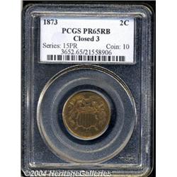 <B>1873<2C> Closed 3 PR65 Red and Brown PCGS.</B></I> An estimated 600 pieces were struck of the Closed 3 variant in 1873. While more frequently encountered than its Open 3 counterpart, the 1873 is, nevertheless, the key to the proof Two Cent series (except, of course, for the extremely rare Small Motto proof). Both sides are well balanced with slight brown patina overlaying the rich, even red luster that is still plentifully obvious throughout. An outstanding coin that appears of full Gem quality. Population: 66 in 65, 15 finer (3/04). <BR><BR><B>Important notice:</B> Heritage usually auctions material at the rate of 200-250 lots per hour. On some occasions eBay Live bid software or the Internet may not be able to keep up with the pace of the auction. We recommend placing a realistic absentee bid now as insurance to avoid disappointment. Occasionally the auctioneer may eliminate or reject an eBay Live bid, and the auctioneer may also reopen a lot after the close of the eBay live bidding (usually because we missed an audience bid), and may reject your bid even if it shows you as the winning bidder. By bidding via eBay Live, you agree that Heritage may award the lot to another bidder at its sole discretion under the circumstances described above or any other reasonable circumstances. Since eBay bids are not shown to us until we open the lot on the floor, we treat those bids just like floor bids. In most cases the floor responds before the eBay bid is presented to us, due to Internet lag time, so for consistency we have made it a policy that floor bids are always considered first over tie eBay live bids. Also please note that all Heritage lots purchased through eBay Live carry a 20% Buyer's Premium. Please make sure you read the Terms and Conditions before you bid.