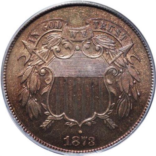 <B>1873 2C Closed 3 PR65 Red and Brown PCGS.</B></I> Rich apple-green and rose-gold adorn this well struck and nearly mark-free Gem. Carbon is limited to a tiny fleck above the right foot of the 1 in the date. A colorful and moderately mirrored example of this popular proof-only issue. Only 600 proofs were struck.<BR><BR><B>Coin Engraver:</B> James B. Longacre<BR><BR><b>Shipping:</b> Coins & Currency (<a target="_blank" href="http://www.heritageauctions.com/common/shipping.php">view shipping information</a>)