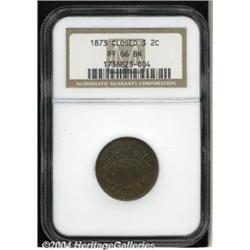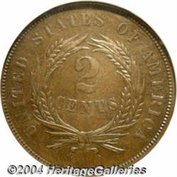 <B>1873<2C> Closed 3 PR66 Brown NGC.</B></I> Only 600 pieces are estimated to have been struck of this final-year issue of the two cent piece. Few have been preserved as meticulously as this coin with surfaces that are essentially free from contact marks. Deep brown patina covers each side with underlying iridescence visible when the coin is tilted just so beneath a light. The highly reflective fields are still abundantly evident even through the rich brown patina. Population: 5 in 66, 0 finer (7/04). <BR><BR><B>Important notice:</B> Heritage usually auctions material at the rate of 200-250 lots per hour. On some occasions eBay Live bid software or the Internet may not be able to keep up with the pace of the auction. We recommend placing a realistic absentee bid now as insurance to avoid disappointment. Occasionally the auctioneer may eliminate or reject an eBay Live bid, and the auctioneer may also reopen a lot after the close of the eBay live bidding (usually because we missed an audience bid), and may reject your bid even if it shows you as the winning bidder. By bidding via eBay Live, you agree that Heritage may award the lot to another bidder at its sole discretion under the circumstances described above or any other reasonable circumstances. Since eBay bids are not shown to us until we open the lot on the floor, we treat those bids just like floor bids. In most cases the floor responds before the eBay bid is presented to us, due to Internet lag time, so for consistency we have made it a policy that floor bids are always considered first over tie eBay live bids. Also please note that all Heritage lots purchased through eBay Live carry a 20% Buyer's Premium. Please make sure you read the Terms and Conditions before you bid. </span></font></tr></table></td></tr></table>