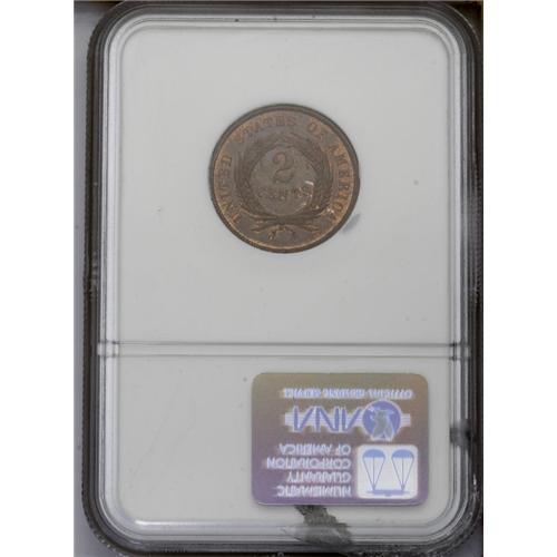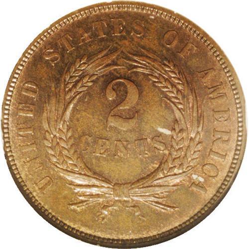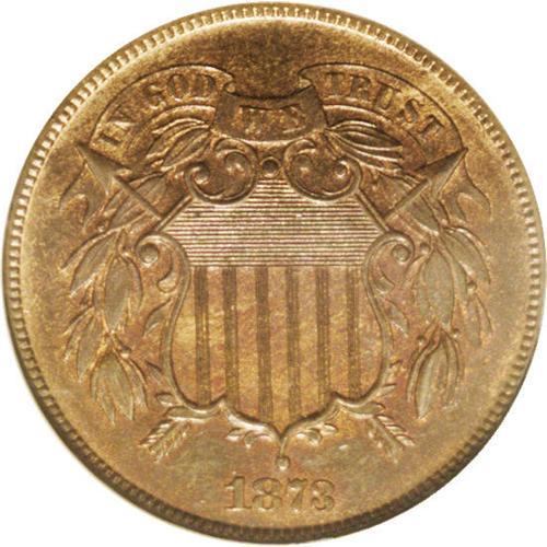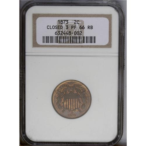 <B>1873<2C> Closed 3 PR66 Red and Brown NGC.</B></I> Faded mint red on both sides with light tan to brown elsewhere. The surfaces are clean and attractive, with no distracting specks or spots. This is the final year of issue for the Two Cent piece, with the reported mintage of 600 pieces. It is believed that at least a portion of these were melted on July 10, 1873 once sales dwindled. Census: 34 in 66, 1 finer (1/06).<BR><I>From The Larj Collection.</B></I>