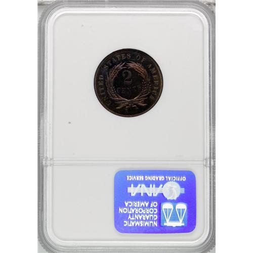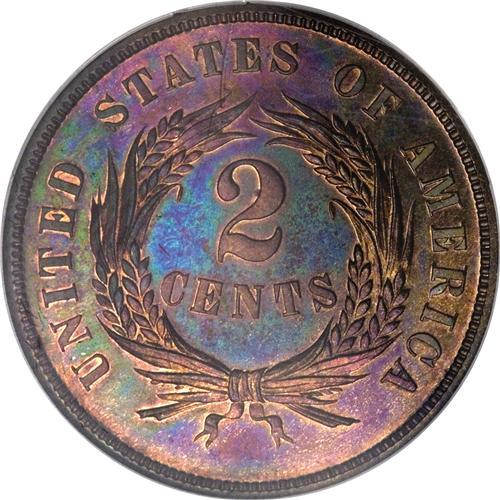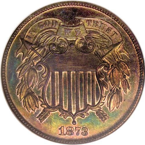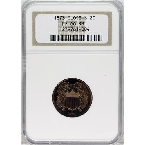 <B>1873 2C Closed 3 PR66 Red and Brown NGC.</B></I> Walter Breen described these Closed 3 coins as "originals" and called the Open 3 pieces "restrikes." He suggested that such coins were probably struck clandestinely at some later date, although it is equally possible that they were struck later in the year as the need arose for additional proofs. This example has a gorgeous presentation of blue, green, and lilac toning with considerable original orange mint color.<BR><BR><b>Shipping:</b> Coins & Currency (<a target="_blank" href="http://www.heritageauctions.com/common/shipping.php">view shipping information</a>)