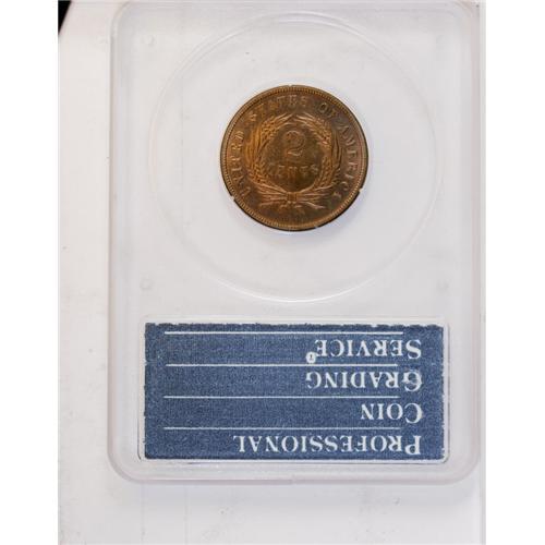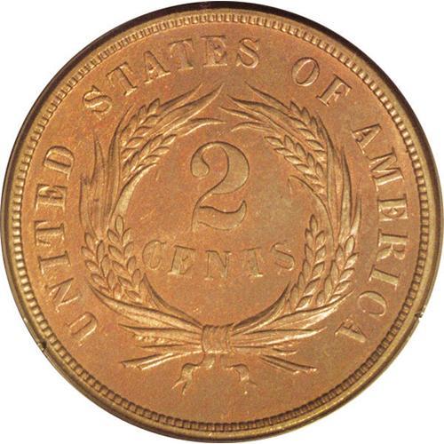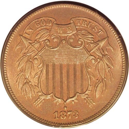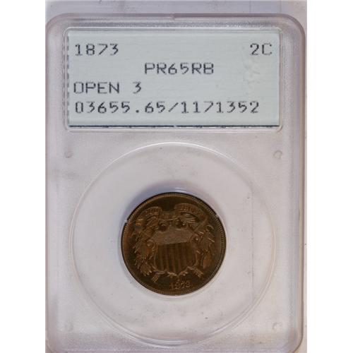 <B>1873<2C> Open 3 PR65 Red and Brown PCGS.</B></I> Walter Breen's <I>Encyclopedia of United States and Colonial Proof Coins 1722-1977</B></I> lists this issue in its chapter on "Fantasy and Experimental Pieces." His nonproof <I>Encyclopedia</B></I> says the issue, struck sometime later than 1873 and therefore a restrike, is about 10 times as rare as the Closed 3 issues. While that may be an exaggeration, they are significantly rarer, likely by a factor of 2x-4x. The present example shows mellow golden-brown surfaces with much original red remaining, and the diagnostic die line to the bottom-left of the T in TRUST is bold. <BR><I>From The Antigo Collection.</B></I>