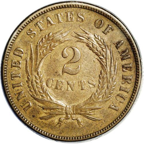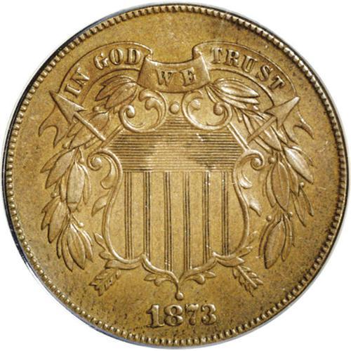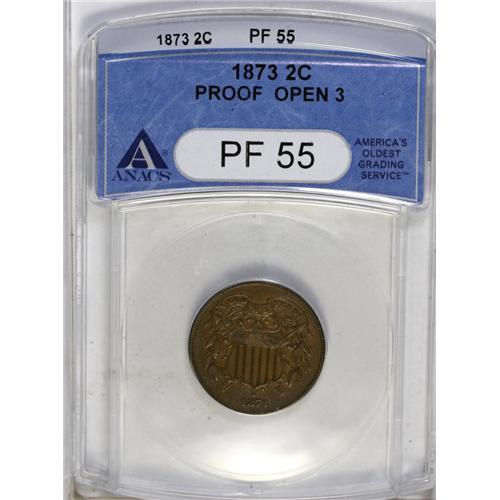 <B>1873<2C> Open 3 PR55 ANACS.</B></I> A lightly circulated proof example. The Open 3 two cent coins have been considered restrikes by many, including apparently Walter Breen, who added a question mark after the word in his <I>Complete Encyclopedia,</B></I> following which he wrote, "Rare. Knobs of 3 over a knob's width apart. Usually weak in central azure and upper third to sixth red stripes. Sometimes carelessly made. Possibly 10 times are rare as [Closed 3 varieties}." This example is a trifle weak on the azures, but not especially so on the stripes. Light rub is evident on the highpoints, but there are few mentionable abrasions or other distractions, and the surfaces are a smooth, glossy medium brown.