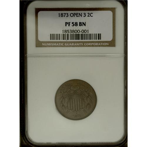 <B>1873 2C Open 3 PR58 NGC.</B></I> This walnut-brown example has a touch too much cabinet friction for a "proper" proof grade, though this makes this still-pleasing proof a remarkable opportunity. The Open 3 (or Restrike) issue had a mintage of only 500 pieces, according to most sources.<BR><BR><b>Shipping:</b> Coin/Currency (<a target="_blank" href="http://www.heritageauctions.com/common/shipping.php">view shipping information</a>)