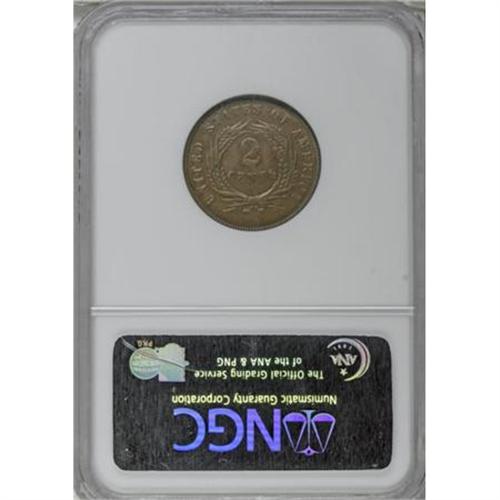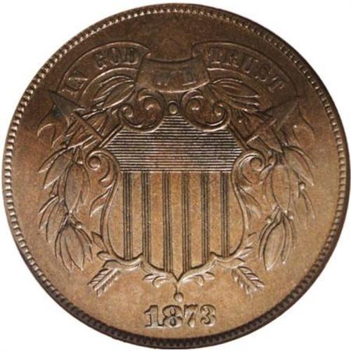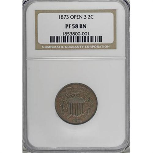 <B>1873 2C Open 3 PR58 NGC.</B></I> This medium-brown proof-only example has selected flatness on WE, the right arrow, and the obverse leaves. NGC has interpreted this flatness as cabinet friction, although an indifferent strike may also be the cause. A small spot is noted near the left arrow, and a minor lamination (as made) resides on the inner right side of the wreath.<I><BR>From The Beau Clerc Collection.</B></I><BR><BR><B>Coin Engraver:</B> James B. Longacre<BR><BR><b>Shipping:</b> Coins & Currency (<a target="_blank" href="http://www.heritageauctions.com/common/shipping.php">view shipping information</a>)