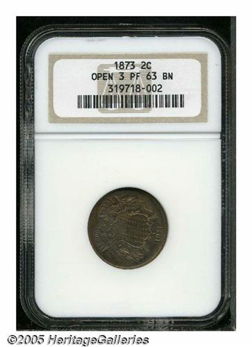 <B>1873<2C> Open 3 PR63 Brown NGC.</B></I> A well struck representative with semi-reflective fields that reveal gold, ruby-red, and powder-blue hues when they are tilted under the light. The Open 3 proofs were assumedly the final coins struck of this denomination, and survivors may be scarcer than the <I>Guide Book</B></I> mintage of 500 pieces would suggest.