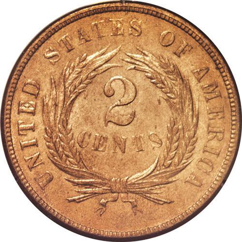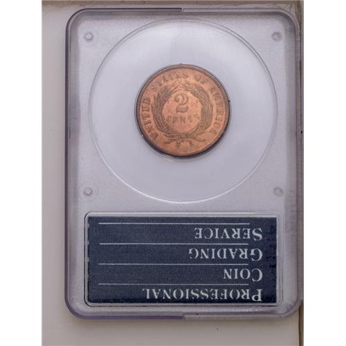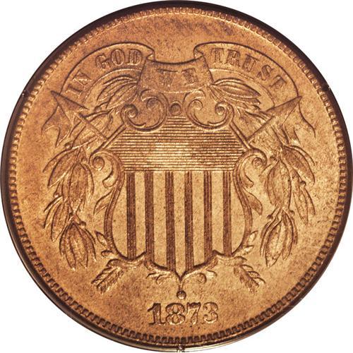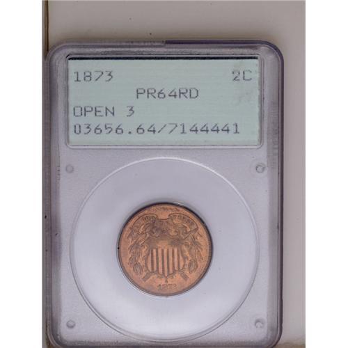 <B>1873<2C> Open 3 PR64 Red PCGS.</B></I> The Open 3 1873 two cent pieces are several times rarer than their Closed 3 counterparts. The Open 3 strikings are the restrikes, and in addition to the difference in the configuration of the 3 in the date, the Open 3 pieces are easily distinguished by weak definition on the lower horizontal crossbars on the shield. The surfaces on this piece are bright and very light in color with pinkish-copper luster. Some minor muting is seen on each side. Housed in a first generation PCGS holder.<BR><I>From The Key Date Coin Collection.</B></I>