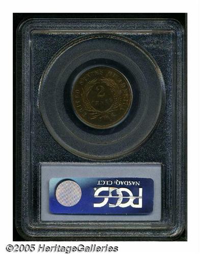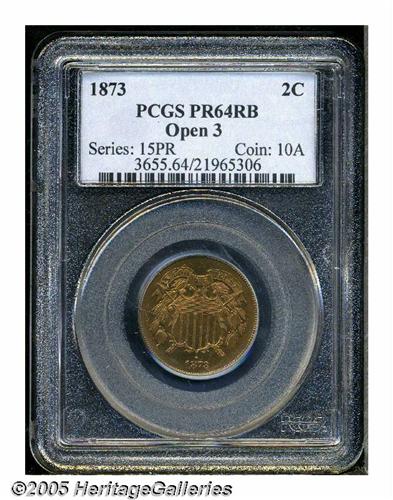 <B>1873<2C> Open 3 PR64 Red and Brown PCGS.</B></I> Sharply struck with somewhat more red than brown. The few imperfections are small and mostly not distracting, the only one worthy of mention is a carbon spot to the left of the date. This is a restrike and much scarcer than the originals. To this description we add only that the surfaces are overlaid with light haziness that mutes the reflectivity at certain angles.