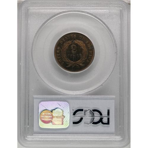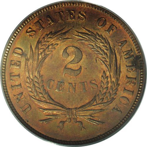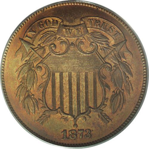<B>1873 2C Open 3 PR64 Red and Brown PCGS.</B></I> Repunched Date. A small notch is noticeable on the upper inner curve of the 3. This shimmering example is particularly attractive, and the reddish-gold and green coloration is lovely, even if not mint red. The fields display pleasing reflectivity and the absence of any hairlines or contact marks. The 1873 Open 3 is a scarce proof-only restrike issue, with an estimated mintage of just 500 pieces.<BR><BR><b>Shipping:</b> Coins & Currency (<a target="_blank" href="http://www.heritageauctions.com/common/shipping.php">view shipping information</a>)