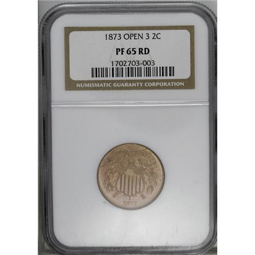 <B>1873<2C> Open 3 PR65 Red NGC.</B></I> Immediately recognizable as an Open 3 by the weak lower horizontal shield lines, a diagnostic of all Open 3s if one is in doubt about the configuration of the 3. Both sides are moderately reflective and exhibit pale pink and reddish-golden color. A scarce restrike issue, one of an estimated 500 pieces produced, and far more difficult than the Closed 3 strikings. Pieces retaining their full red color are of particular rarity, with this piece among the finer known examples. Census: 5 in 65, 3 finer (3/06).<BR><I>From The David L. Goodwin Collection.</B></I> <BR><BR><B>Important notice:</B> Heritage usually auctions material at the rate of 200-250 lots per hour. On some occasions eBay Live bid software or the Internet may not be able to keep up with the pace of the auction. We recommend placing a realistic absentee bid now as insurance to avoid disappointment. Occasionally the auctioneer may eliminate or reject an eBay Live bid, and the auctioneer may also reopen a lot after the close of the eBay live bidding (usually because we missed an audience bid), and may reject your bid even if it shows you as the winning bidder. By bidding via eBay Live, you agree that Heritage may award the lot to another bidder at its sole discretion under the circumstances described above or any other reasonable circumstances. Since eBay bids are not shown to us until we open the lot on the floor, we treat those bids just like floor bids. In most cases the floor responds before the eBay bid is presented to us, due to Internet lag time, so for consistency we have made it a policy that floor bids are always considered first over tie eBay live bids. Also please note that all Heritage lots purchased through eBay Live carry a 20% Buyer's Premium. Please make sure you read the Terms and Conditions before you bid. This lot is being auctioned in conjunction with a live floor auction by Heritage Galleries & Auctioneers. All final auction and invoice information will be supplied by Heritage Galleries & Auctioneers, and all other information should be considered preliminary. Lot:751 <BR><BR><B>Winning Notification and Billing:</B> After the FINAL session in this auction is complete, Heritage will send e-mail and snail mail invoices. This process normally takes several days. All final auction and invoice information will be supplied by Heritage Galleries & Auctioneers, and all other information should be considered preliminary. <BR><BR>This auction will be conducted on a live auction floor and over the Internet through eBay Live. If you choose to place an absentee bid, please take a moment to <font color='#0000ff'><u><a href='http://pages.ebay.com/liveauctions/help/before/laabsentee.html'>learn how eBay Live absentee bidding works</a></u></font><font color='#000000'>