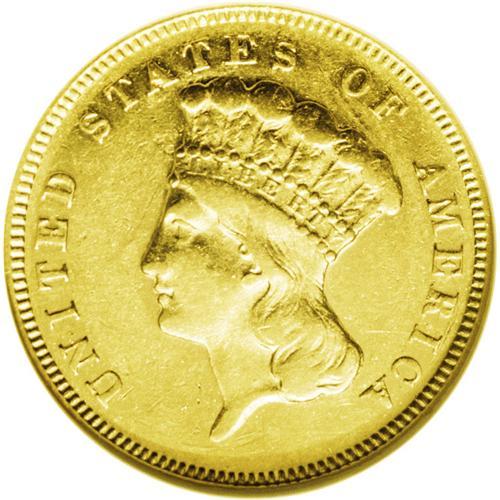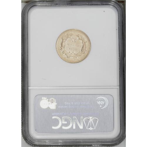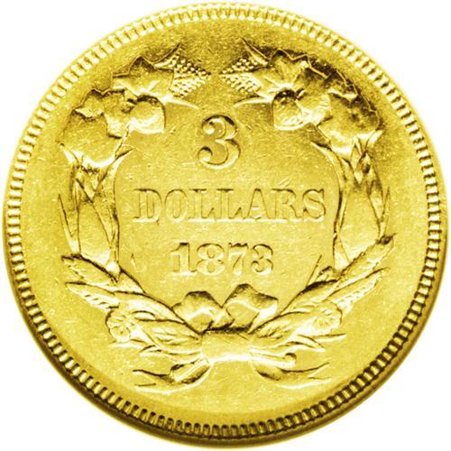<B>1873<$3> Closed 3 AU53 NGC.</B></I> Distinct semi-prooflikeness remains evident in the fields, and Liberty's profile is noticeably doubled. Abrasions are minimal for the grade, but moderate highpoint wear is noted on each side. In a series replete with rarities and enigmatic issues, the 1873 Closed 3 is unique as the only business strike three dollar gold piece without a recorded mintage. Estimates of the number of pieces produced ranges from 200-1,000 coins. Census: 8 in 53, 33 finer (9/06).