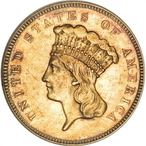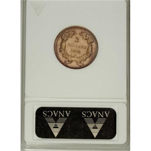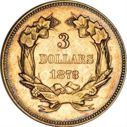 <B>1873 $3 Closed 3--Cleaned--ANACS. AU Details, Net XF45.</B></I> The new preferred terminology in some numismatic quarters is "Close 3" rather than "Closed 3," since the numeral is still open, while "closer" than on the Open 3. This piece is lightly hairlined and overbright, but still attractive, with pinkish-gold and mauve around the devices.<BR><BR><B>Coin Engraver:</B> James B. Longacre<BR><BR><b>Shipping:</b> Coins & Currency (<a target="_blank" href="http://www.heritageauctions.com/common/shipping.php">view shipping information</a>)