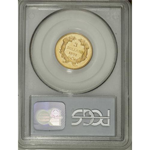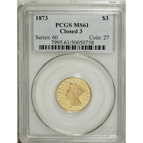 <B>1873 $3 Closed 3 MS61 PCGS.</B></I> Among three dollar gold issues, a series replete with rarities and enigmatic issues, the 1873 Closed 3 is unique as the only business strike three dollar gold piece without a recorded mintage. The number of pieces originally produced is generally conceded to be between 600 and 1,000 coins, but these are only estimates. The few known Mint State survivors are known to possesses distinctive prooflike qualities, as does this flashy example. Abrasions are fairly numerous, but evenly distributed with none being worthy of individual mention. Look for considerable bidder interest on this dazzling, unquestionably elusive 1873 Closed 3. Population: 5 in 61, 4 finer (11/06).<BR><BR><b>Shipping:</b> Coin/Currency (<a target="_blank" href="http://www.heritageauctions.com/common/shipping.php">view shipping information</a>)