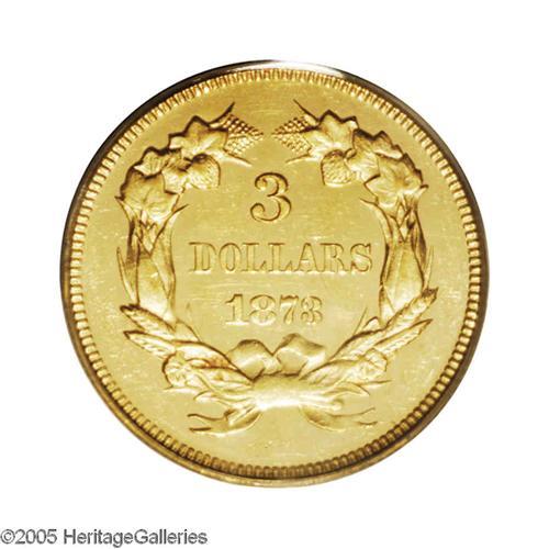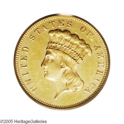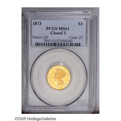 <B>1873<$3> Closed 3 MS61 PCGS.</B></I> The 1873 is an impressive rarity, whether it is a Closed or Open 3 variant. The Open 3 coins are very seldom encountered with only 25 pieces believed struck. The Closed 3 date had an estimated mintage of 1,000 coins, which pales in comparison to its Open 3 counterpart, yet is still a significant absolute and condition rarity in the three dollar series. Both of the major grading services have only certified eight coins in MS61 with six finer (11/05), minus an uncertain number of resubmissions. The fields on this piece show the expected reflectivity and there is a significant amount of contrast apparent against the frosted devices. The striking details lack a bit of highpoint detail and each side shows numerous small abrasions that account for the grade.