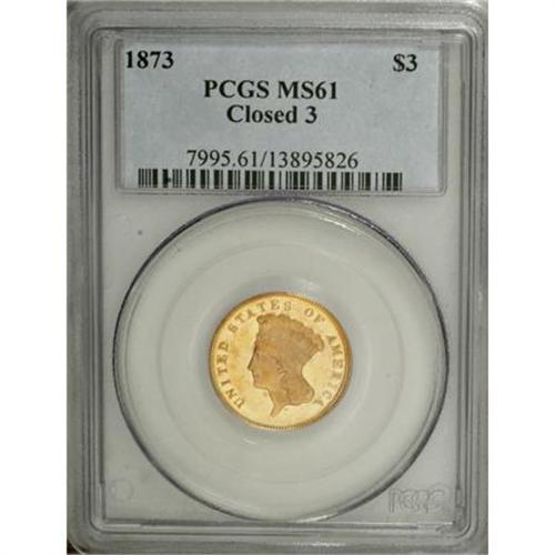 <B>1873 $3 Closed 3 MS61 PCGS.</B></I> Among three dollar gold issues, a series replete with rarities and enigmatic issues, the 1873 Closed 3 is unique as the only business strike three dollar gold piece without a recorded mintage. The number of pieces originally produced is generally conceded to be between 600 and 1,000 coins, but these are only estimates. The few known Mint State survivors are known to possesses distinctive prooflike qualities, as does this flashy example. Abrasions are fairly numerous, but evenly distributed with none being worthy of individual mention. Look for considerable bidder interest on this dazzling, unquestionably elusive 1873 Closed 3. Population: 5 in 61, 4 finer (2/08).<BR><BR><B>Coin Engraver:</B> James B. Longacre<BR><BR><b>Shipping:</b> Coins & Currency (<a target="_blank" href="http://www.heritageauctions.com/common/shipping.php">view shipping information</a>)