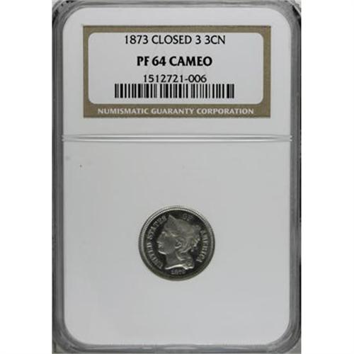 <B>1873 3CN Closed 3 PR64 Cameo NGC.</B></I> NGC Census: (10/44). PCGS Population (13/46). (#83769)<BR><BR><b>Shipping:</b> Coins & Currency (<a target="_blank" href="http://www.heritageauctions.com/common/shipping.php">view shipping information</a>)