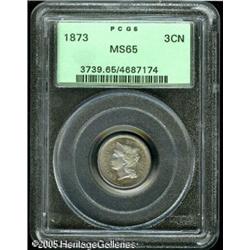 <B>1873 3CN Closed 3 MS65 PCGS.</B></I> Pale mauve and powder-blue patina overlays lustrous surfaces. Sharply struck and well preserved. Population: 24 in 65, 7 finer (1/05). Lot:5704