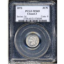 <B>1873<3CN> Closed 3 MS65 PCGS.</B></I> Well struck with thick, frosted mint luster, the striking details are well (but not fully) defined and there are heavy die clash marks on each side. <BR><BR><B>Important notice:</B> Heritage usually auctions material at the rate of 200-250 lots per hour. On some occasions eBay Live bid software or the Internet may not be able to keep up with the pace of the auction. We recommend placing a realistic absentee bid now as insurance to avoid disappointment. Occasionally the auctioneer may eliminate or reject an eBay Live bid, and the auctioneer may also reopen a lot after the close of the eBay live bidding (usually because we missed an audience bid), and may reject your bid even if it shows you as the winning bidder. By bidding via eBay Live, you agree that Heritage may award the lot to another bidder at its sole discretion under the circumstances described above or any other reasonable circumstances. Since eBay bids are not shown to us until we open the lot on the floor, we treat those bids just like floor bids. In most cases the floor responds before the eBay bid is presented to us, due to Internet lag time, so for consistency we have made it a policy that floor bids are always considered first over tie eBay live bids. Also please note that all Heritage lots purchased through eBay Live carry a 20% Buyer's Premium. Please make sure you read the Terms and Conditions before you bid.