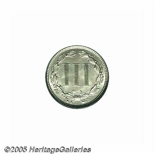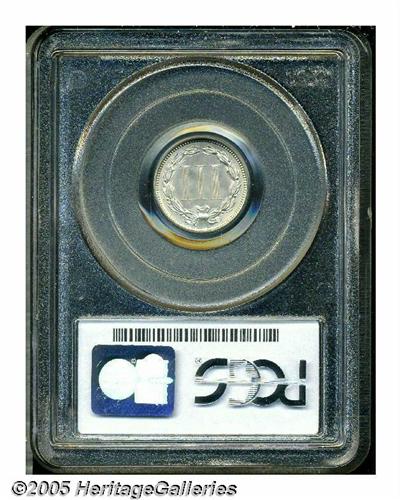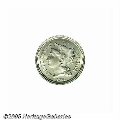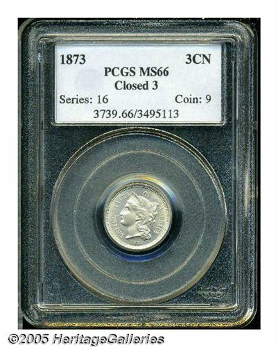 <B>1873<3CN> Closed 3 MS66 PCGS.</B></I> A thin layer of pale opaque toning accents the underlying lustrous surfaces. The strike is bold and the surfaces essentially free of detracting marks. The scarcer of the two varieties issued in this year and very elusive in Gem and finer conditions. Population: 7 in 66, 0 finer (5/05).