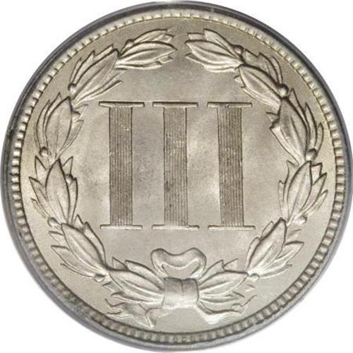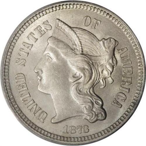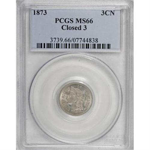 <B>1873 3CN Closed 3 MS66 PCGS.</B></I> The Closed 3 pieces represent a distinct minority of the total annual production. Walter Breen estimated the respective mintage totals to be 390,000 Closed 3 coins and 783,000 Open 3 coins, based on quarterly delivery figures. This Premium Gem specimen is tied for the finest certified, and it is sharply detailed with frosty luster and subliminal champagne toning over pleasing light gray surfaces. Population: 8 in 66, 0 finer (8/07).<BR><BR><B>Coin Engraver:</B> James B. Longacre<BR><BR><b>Shipping:</b> Coins & Currency (<a target="_blank" href="http://www.heritageauctions.com/common/shipping.php">view shipping information</a>)