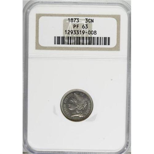 <B>1873 3CN Closed 3 PR63 NGC.</B></I> NGC Census: (34/265). PCGS Population (95/316). Mintage: 1,100. Numismedia Wsl. Price for NGC/PCGS coin in PR63: $230. (#3769)<BR><BR><b>Shipping:</b> Coins & Currency (<a target="_blank" href="http://www.heritageauctions.com/common/shipping.php">view shipping information</a>)