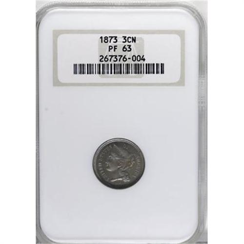 <B>1873 3CN Closed 3 PR63 NGC.</B></I> NGC Census: (34/265). PCGS Population (96/322). Mintage: 1,100. Numismedia Wsl. Price for NGC/PCGS coin in PR63: $260. (#3769)<BR><BR><B>Coin Engraver:</B> James B. Longacre<BR><BR><b>Shipping:</b> Coins & Currency (<a target="_blank" href="http://www.heritageauctions.com/common/shipping.php">view shipping information</a>)