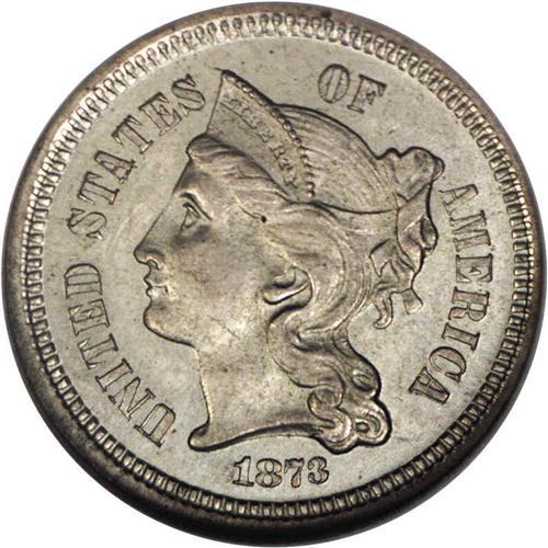 <B>1873<3CN> Closed 3 PR64 NGC.</B></I> Semi-bright light gray, frosty surfaces display well struck design features reveal just a few minor, grade-defining handling marks. A minute fleck in the hair at Liberty's temple is mentioned for accuracy. A pleasing Near-Gem Proof. Envelope Included.