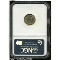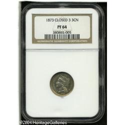 1873 3CN Closed 3 PR64 NGC. Whispers of olive-gold <B>1873 3CN Closed 3 PR64 NGC.</B></I> Whispers of olive-gold color, and well struck design elements. A few flyspecks are seen over each side. <BR><BR><B>Important notice:</B> Heritage usually auctions material at the rate of 200-250 lots per hour. On some occasions eBay Live bid software or the Internet may not be able to keep up with the pace of the auction. We recommend placing a realistic absentee bid now as insurance to avoid disappointment. Occasionally the auctioneer may eliminate or reject an eBay Live bid, and the auctioneer may also reopen a lot after the close of the eBay live bidding (usually because we missed an audience bid), and may reject your bid even if it shows you as the winning bidder. By bidding via eBay Live, you agree that Heritage may award the lot to another bidder at its sole discretion under the circumstances described above or any other reasonable circumstances. Since eBay bids are not shown to us until we open the lot on the floor, we treat those bids just like floor bids. In most cases the floor responds before the eBay bid is presented to us, due to Internet lag time, so for consistency we have made it a policy that floor bids are always considered first over tie eBay live bids. Also please note that all Heritage lots purchased through eBay Live carry a 20% Buyer's Premium. Please make sure you read the Terms and Conditions before you bid. This lot is being auctioned in conjunction with a live floor auction by Heritage Galleries & Auctioneers. All final auction and invoice information will be supplied by Heritage Galleries & Auctioneers, and all other information should be considered preliminary. Lot:5498