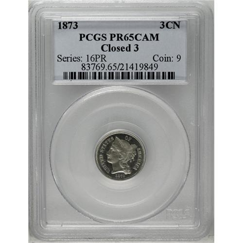 1873 3CN Closed 3 PR65 Cameo PCGS. The Closed 3 proof, 1873
