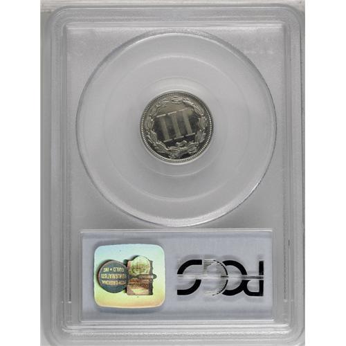 <B>1873<3CN> Closed 3 PR65 Cameo PCGS.</B></I> The Closed 3 proof, struck early in the year as were all proof examples of this date. After complaints were received about the appearance of the digit 3 (it resembled an 8), new dies were created with a Open 3 in the date. All proofs were struck from the initial dies. This delightful Gem has light nickel-gray surfaces with excellent contrast. There is no evidence of toning on either side.
