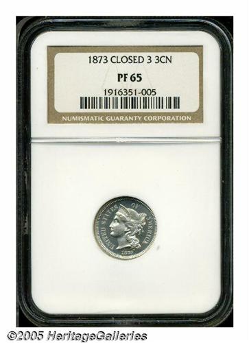 <B>1873<3CN> Closed 3 PR65 NGC.</B></I> This virtually brilliant Gem exhibits impressive reflectivity, and the preservation is exemplary. The strike is sharp aside from occasional softness on the denominational pillars.