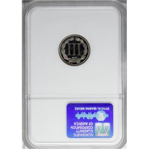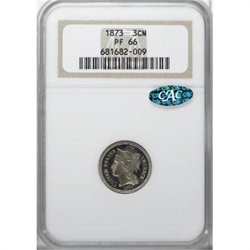 <B>1873 3CN Closed 3 PR66 NGC. CAC.</B></I> The reverse of this Premium Gem proof displays Cameo tendencies. Both sides are lightly toned and sharply struck. A few light flecks are visible on the reverse. Census: 25 in 66, 4 finer (1/08).<BR><I>From The Southwest Collection.</B></I><BR><BR><B>Coin Engraver:</B> James B. Longacre<BR><BR><b>Shipping:</b> Coins & Currency (<a target="_blank" href="http://www.heritageauctions.com/common/shipping.php">view shipping information</a>)
