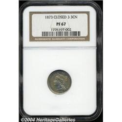 <B>1873<3CN> Closed 3 PR67 NGC.</B></I> Closed 3, as are all proofs of this date and denomination. This Superb Gem is fully struck and exquisitely preserved, with mark-free, mildly reflective, beautifully toned surfaces, showing a pleasing mix of sea-green, beige-gray, and apricot toning. Population: 2 in 67, 0 finer (4/04). <BR><BR><B>Important notice:</B> Heritage usually auctions material at the rate of 200-250 lots per hour. On some occasions eBay Live bid software or the Internet may not be able to keep up with the pace of the auction. We recommend placing a realistic absentee bid now as insurance to avoid disappointment. Occasionally the auctioneer may eliminate or reject an eBay Live bid, and the auctioneer may also reopen a lot after the close of the eBay live bidding (usually because we missed an audience bid), and may reject your bid even if it shows you as the winning bidder. By bidding via eBay Live, you agree that Heritage may award the lot to another bidder at its sole discretion under the circumstances described above or any other reasonable circumstances. Since eBay bids are not shown to us until we open the lot on the floor, we treat those bids just like floor bids. In most cases the floor responds before the eBay bid is presented to us, due to Internet lag time, so for consistency we have made it a policy that floor bids are always considered first over tie eBay live bids. Also please note that all Heritage lots purchased through eBay Live carry a 20% Buyer's Premium. Please make sure you read the Terms and Conditions before you bid.