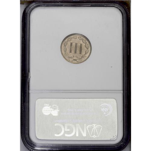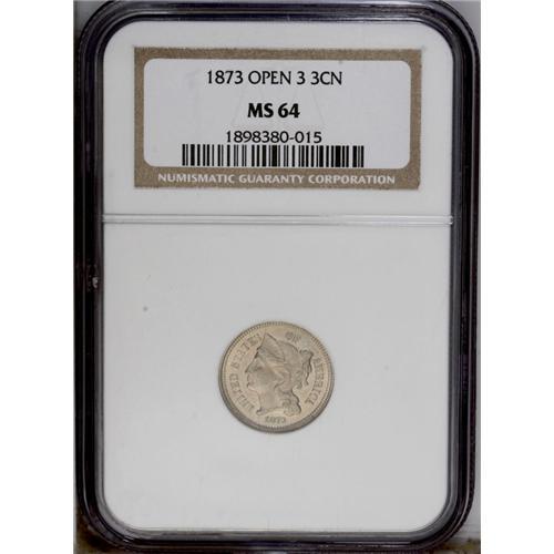 <B>1873<3CN> Open 3 MS64 NGC.</B></I> Highly lustrous with grayish-gold color and excellent eye appeal. The Open 3 variety is not as difficult to locate as the Closed 3, but it is still an elusive coin, especially in the better Mint State grades. <BR><BR><B>Important notice:</B> Heritage usually auctions material at the rate of 200-250 lots per hour. On some occasions eBay Live bid software or the Internet may not be able to keep up with the pace of the auction. We recommend placing a realistic absentee bid now as insurance to avoid disappointment. Occasionally the auctioneer may eliminate or reject an eBay Live bid, and the auctioneer may also reopen a lot after the close of the eBay live bidding (usually because we missed an audience bid), and may reject your bid even if it shows you as the winning bidder. By bidding via eBay Live, you agree that Heritage may award the lot to another bidder at its sole discretion under the circumstances described above or any other reasonable circumstances. Since eBay bids are not shown to us until we open the lot on the floor, we treat those bids just like floor bids. In most cases the floor responds before the eBay bid is presented to us, due to Internet lag time, so for consistency we have made it a policy that floor bids are always considered first over tie eBay live bids. Also please note that all Heritage lots purchased through eBay Live carry a 20% Buyer's Premium. Please make sure you read the Terms and Conditions before you bid. This lot is being auctioned in conjunction with a live floor auction by Heritage Galleries & Auctioneers. All final auction and invoice information will be supplied by Heritage Galleries & Auctioneers, and all other information should be considered preliminary. Lot:787 <BR><BR><B>Winning Notification and Billing:</B> After the FINAL session in this auction is complete, Heritage will send e-mail and snail mail invoices. This process normally takes several days. All final auction and invoice information will be supplied by Heritage Galleries & Auctioneers, and all other information should be considered preliminary. <BR><BR>This auction will be conducted on a live auction floor and over the Internet through eBay Live. If you choose to place an absentee bid, please take a moment to <font color='#0000ff'><u><a href='http://pages.ebay.com/liveauctions/help/before/laabsentee.html'>learn how eBay Live absentee bidding works</a></u></font><font color='#000000'>