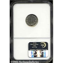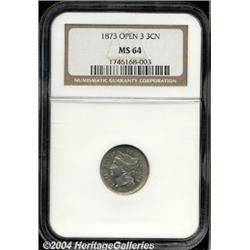 <B>1873<3CN> Open 3 MS64 NGC.</B></I> A luminous, well struck near-Gem, with silver-gray surfaces that reveal just a few trivial, hardly noticeable contacts. A planchet flake (as produced) is noted in the obverse field near the rim at about 7 o'clock. Population: 10 in 64, 4 finer (4/04). <BR><BR><B>Important notice:</B> Heritage usually auctions material at the rate of 200-250 lots per hour. On some occasions eBay Live bid software or the Internet may not be able to keep up with the pace of the auction. We recommend placing a realistic absentee bid now as insurance to avoid disappointment. Occasionally the auctioneer may eliminate or reject an eBay Live bid, and the auctioneer may also reopen a lot after the close of the eBay live bidding (usually because we missed an audience bid), and may reject your bid even if it shows you as the winning bidder. By bidding via eBay Live, you agree that Heritage may award the lot to another bidder at its sole discretion under the circumstances described above or any other reasonable circumstances. Since eBay bids are not shown to us until we open the lot on the floor, we treat those bids just like floor bids. In most cases the floor responds before the eBay bid is presented to us, due to Internet lag time, so for consistency we have made it a policy that floor bids are always considered first over tie eBay live bids. Also please note that all Heritage lots purchased through eBay Live carry a 20% Buyer's Premium. Please make sure you read the Terms and Conditions before you bid.