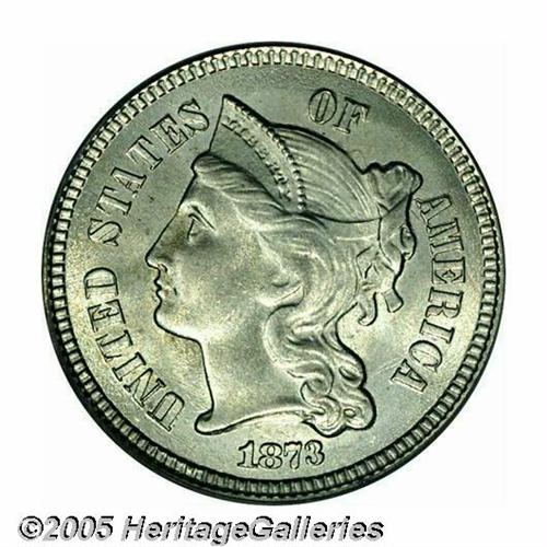 <B>1873<3CN> Open 3 MS65 PCGS.</B></I> Generally very well struck, with a shimmering, satiny appearance and a near-absence of carbon. Faint die clashing is noted on the obverse. Quite scarce as a Gem despite a fairly substantial mintage of 783,000 pieces. Population: 8 in 65, 0 finer (4/05).<BR><I>From The Western Hills Collection.</B></I>