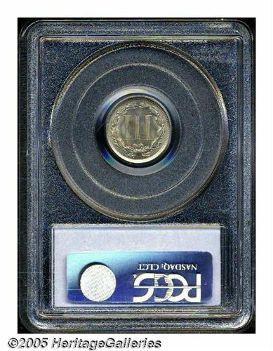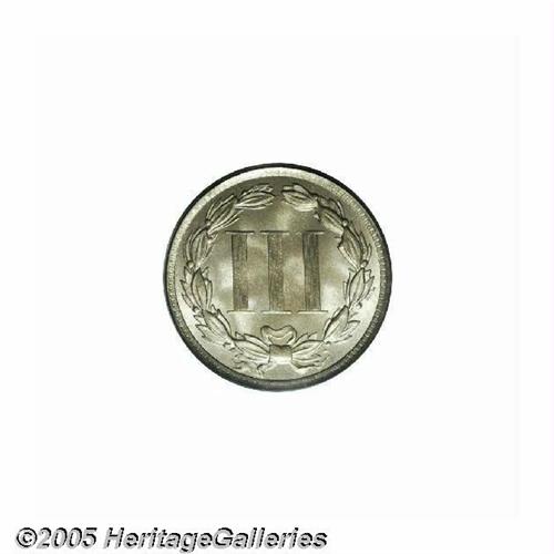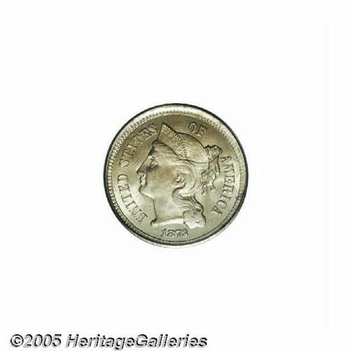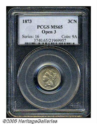 <B>1873<3CN> Open 3 MS65 PCGS.</B></I> The open 3 is scarce in Gem condition. This specimen has light golden patina overlying satiny, essentially blemish-free surfaces. Strike weakness shows on portions of the central devices. Population: 8 in 65, 0 finer (6/05).