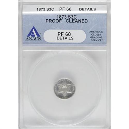 <B>1873 3CS --Cleaned--ANACS .PR60 Details.</B></I> NGC Census: (2/297). PCGS Population (9/370). Mintage: 600. Numismedia Wsl. Price for NGC/PCGS coin in PR60: $975. (#3724)<BR><BR><B>Coin Engraver:</B> James B. Longacre<BR><BR><b>Shipping:</b> Coins & Currency (<a target="_blank" href="http://www.heritageauctions.com/common/shipping.php">view shipping information</a>)