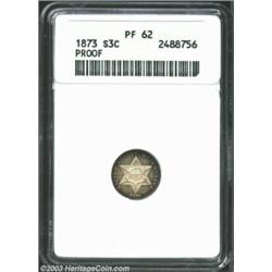 1873 3CS PR62 ANACS. Fabulous rainbow toning appears when this proof survivor is turned beneath a light. The coin remains attractive despite some minor hairlines on either side. This was the final year for the series, and only proof coins were issued, with an official mintage of just 600 pieces.From the Dr. Richard Tavernetti Collection. Important notice: We expect to be auctioning lots at the rate of 200-250 per hour. On occasion eBay live bid software cannot keep up with the pace of the auctions where 4-5 lots per minute can hammer down, so we recommend that you place a realistic absentee bid now as insurance to avoid disappointment. Also please note that all Heritage/CAA lots purchased through eBay Live carry a 20% Buyer's Premium. Please make sure you read the Terms and Conditions.