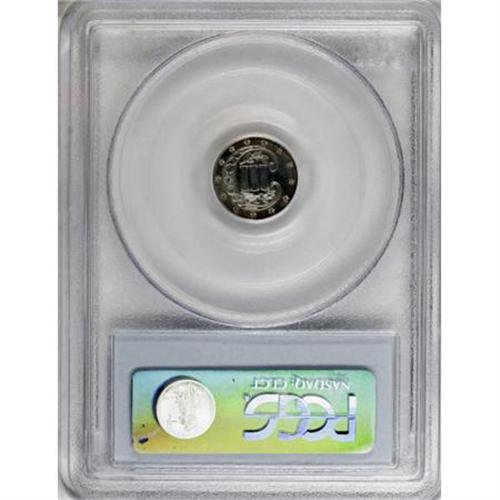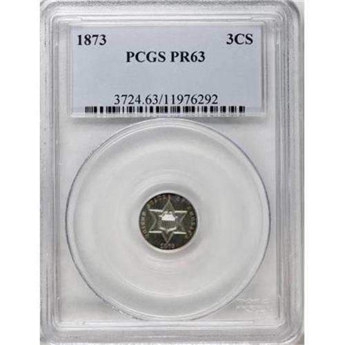 <B>1873 3CS PR63 PCGS.</B></I> Gleaming silver-gray mirrors predominate on this well-defined Select example, while elements of rust-orange grace the margins. Lightly hairlined, yet appealing. One of only 600 specimens struck.<BR><BR><B>Coin Engraver:</B> James B. Longacre<BR><BR><b>Shipping:</b> Coins & Currency (<a target="_blank" href="http://www.heritageauctions.com/common/shipping.php">view shipping information</a>)