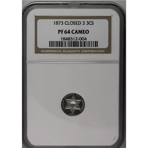 <B>1873<3CS> PR64 Cameo NGC.</B></I> This is a splendid proof with fully brilliant obverse and reverse surfaces. The fields have deep mirrors and the devices have intense luster. All of the design elements are sharply detailed and the eye appeal is exceptional for the grade.<BR><I>From The Catfish Creek Collection.</B></I>