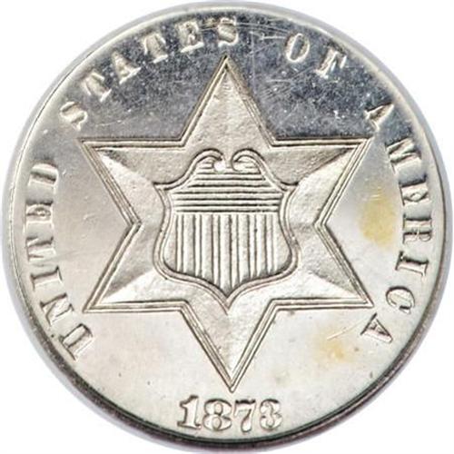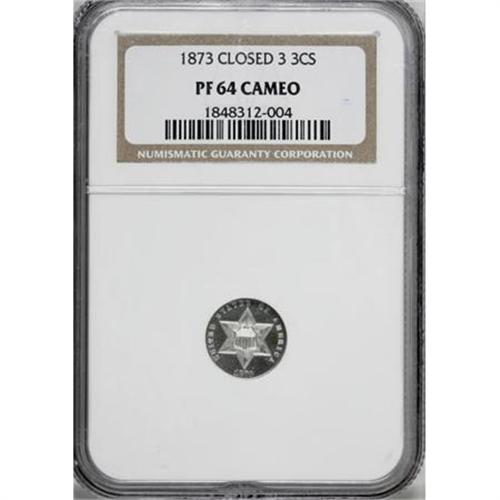 <B>1873 3CS PR64 Cameo NGC.</B></I> This is a splendid proof with fully brilliant obverse and reverse surfaces. The fields have deep mirrors and the devices have intense luster. All of the design elements are sharply detailed and the eye appeal is exceptional for the grade. Population: 17 in 64 Cameo, 7 finer (10/07).<BR><BR><b>Shipping:</b> Coins & Currency (<a target="_blank" href="http://www.heritageauctions.com/common/shipping.php">view shipping information</a>)