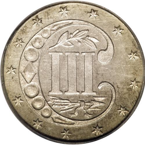 <B>1873 3CS PR64 Cameo PCGS.</B></I> All 600 specimens for the 1873 proof-only issue display the close 3, replaced later in the year for its resemblance to an 8. The obverse of this lovely piece displays soft silver-gray toning with amber-gold at the margins, while the reverse displays a bronze wash against cloud-gray surfaces. Minor hairlines in the fields restrict the grade. Population: 13 in 64 Cameo, 8 finer (4/07).<BR><BR><b>Shipping:</b> Coins & Currency (<a target="_blank" href="http://www.heritageauctions.com/common/shipping.php">view shipping information</a>)