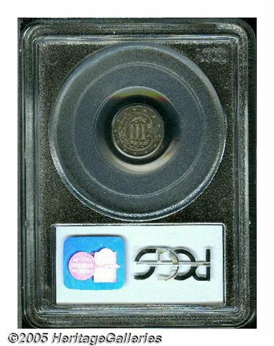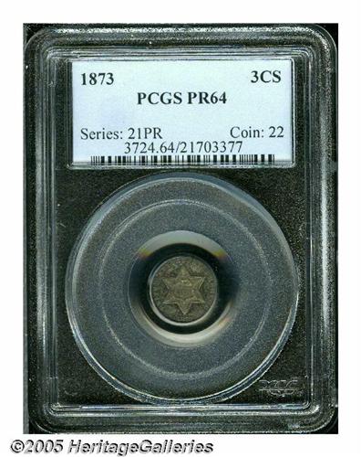 <B>1873<3CS> PR64 PCGS.</B></I> Dappled tan and aquamarine colors enrich this needle-sharp near-Gem. The obverse field has minor marks near the U in UNITED and the M in AMERICA.