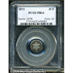 <B>1873<3CS> PR64 PCGS.</B></I> Peach and powder-blue colors enrich this needle-sharp and carbon-free specimen. A few wispy hairlines in the fields do not distract. A proof-only date that finished off the series. Just 600 pieces were struck. <BR><BR><B>Important notice:</B> Heritage usually auctions material at the rate of 200-250 lots per hour. On some occasions eBay Live bid software or the Internet may not be able to keep up with the pace of the auction. We recommend placing a realistic absentee bid now as insurance to avoid disappointment. Occasionally the auctioneer may eliminate or reject an eBay Live bid, and the auctioneer may also reopen a lot after the close of the eBay live bidding (usually because we missed an audience bid), and may reject your bid even if it shows you as the winning bidder. By bidding via eBay Live, you agree that Heritage may award the lot to another bidder at its sole discretion under the circumstances described above or any other reasonable circumstances. Since eBay bids are not shown to us until we open the lot on the floor, we treat those bids just like floor bids. In most cases the floor responds before the eBay bid is presented to us, due to Internet lag time, so for consistency we have made it a policy that floor bids are always considered first over tie eBay live bids. Also please note that all Heritage lots purchased through eBay Live carry a 20% Buyer's Premium. Please make sure you read the Terms and Conditions before you bid.